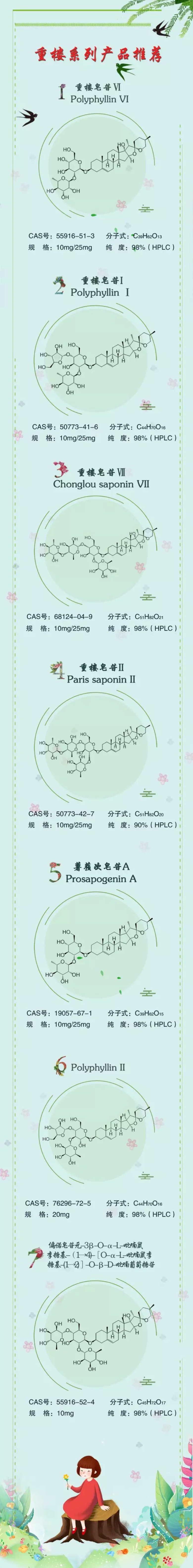 重樓皂苷Ⅵ、重樓皂苷I、重樓皂苷Ⅶ、重樓皂苷II、薯蕷次皂苷A、Polyphyllin II、偏諾皂苷元-3β-O-α-L-吡喃鼠李糖基-(1→ 4 )-[O-α-L-吡喃鼠李糖基-( 1→2) ]-O-β-D-吡喃葡萄糖苷,產品信息如下: